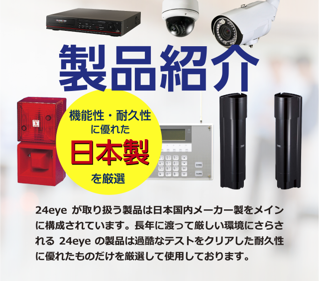 24eyeが取り扱う製品は日本国内メーカー製をメインに構成されています。長年に渡って厳しい環境にさらされる24eyeの製品は過酷なテストをクリアした耐久性に優れたものだけを厳選して使用しております。